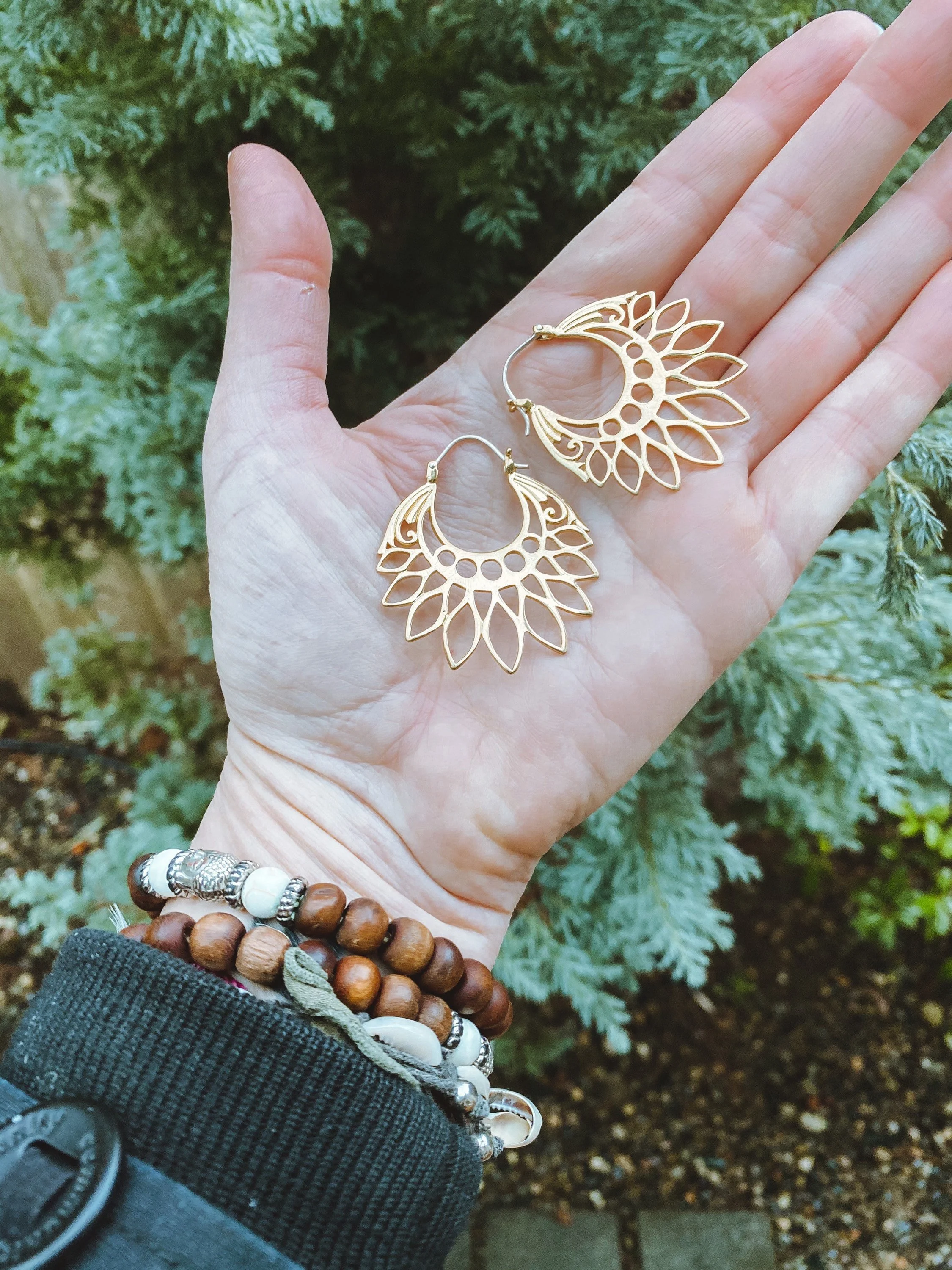 These sun/moon hoop earrings are made by a local Balinese artisan. The sun is often connected to rebirth, strength and power and is traditionally considered the symbol for masculinity. The moon is often connected to intuition, dreaming, imagination, feelings and emotions. It has been traditionally associated with femininity. The sun and moon together can represent the merging of opposites, unity and cooperation instead of conflict.